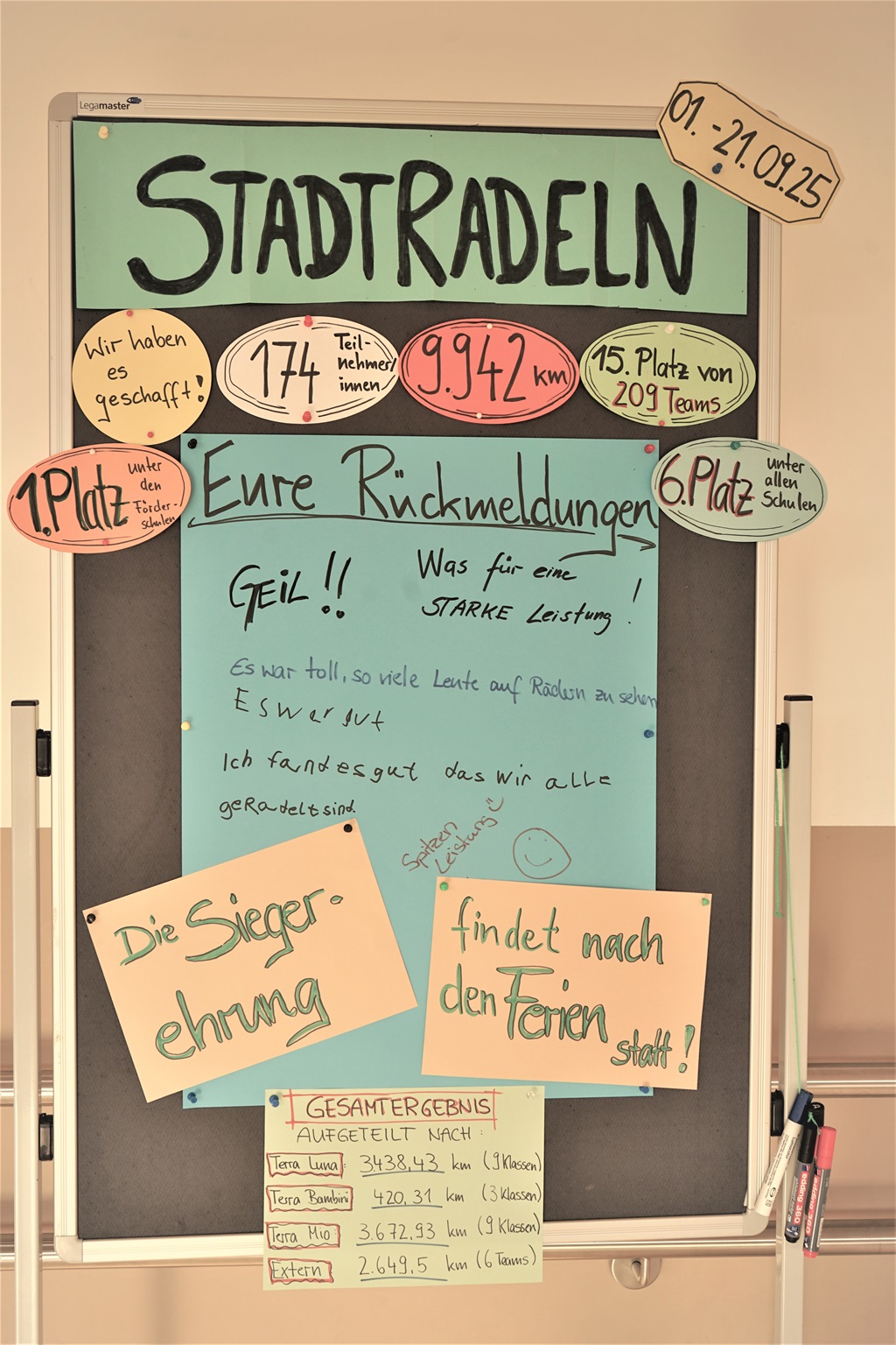 Das sind die Pokale, die die Klassen mit den meisten Kilometern gefahren sind, erhalten haben: Bambini: 3a und 3b, Luna: 7c, Mio: M2, andere Angestellte: Team Schulleitung. Alle Lehrer und pädagogischen Fachkräfte, die alleine gestartet sind (u.a. App-Nutzung) haben insgesamt 1533,40 km erreicht!